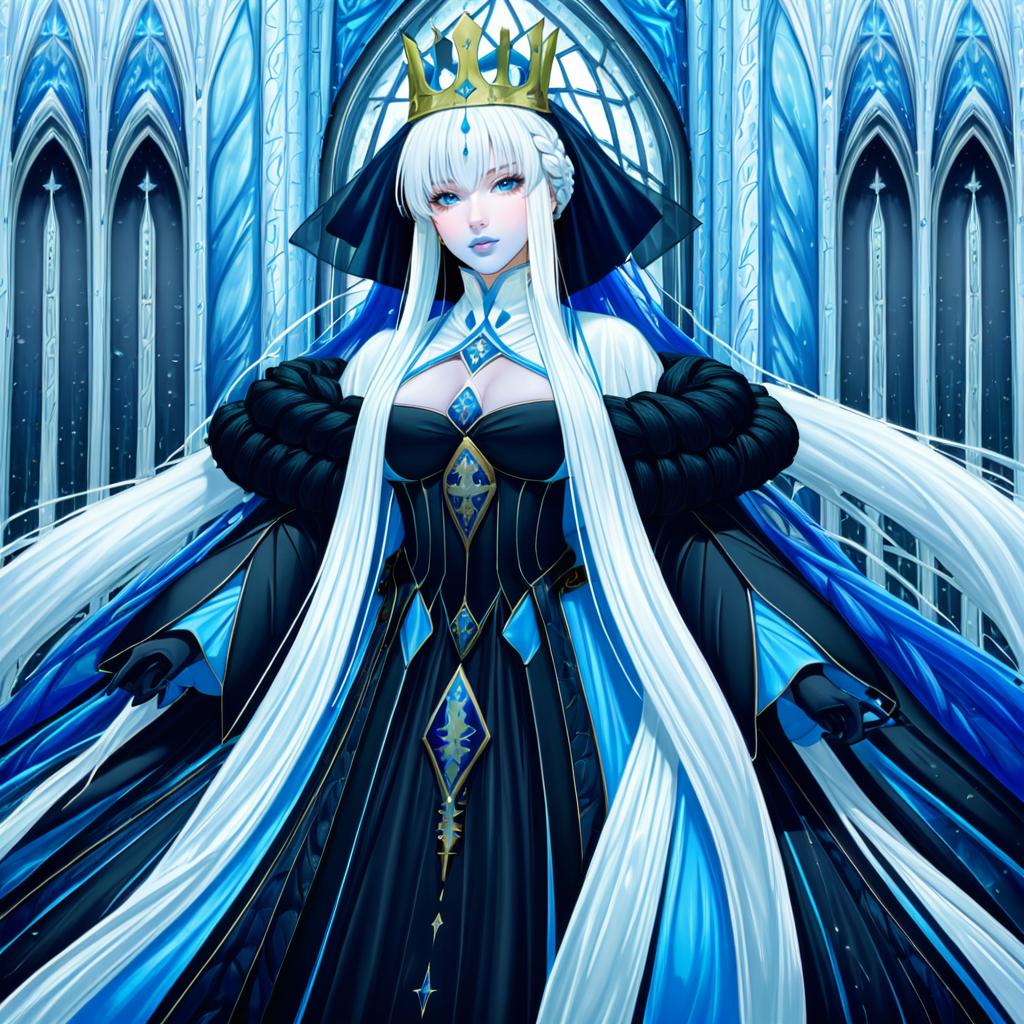 Morgan le fay (queen of winter) (fate), fate/grand order, 1girl, blue lips, blue eyes, very long hair, grey hair, white hair, ponytail, sidelocks, french braid, braid, large breasts, black dress, two-tone dress, veil, black gloves, long sleeves, wide sleeves, crown, by artist ranma (kamenrideroz), anime