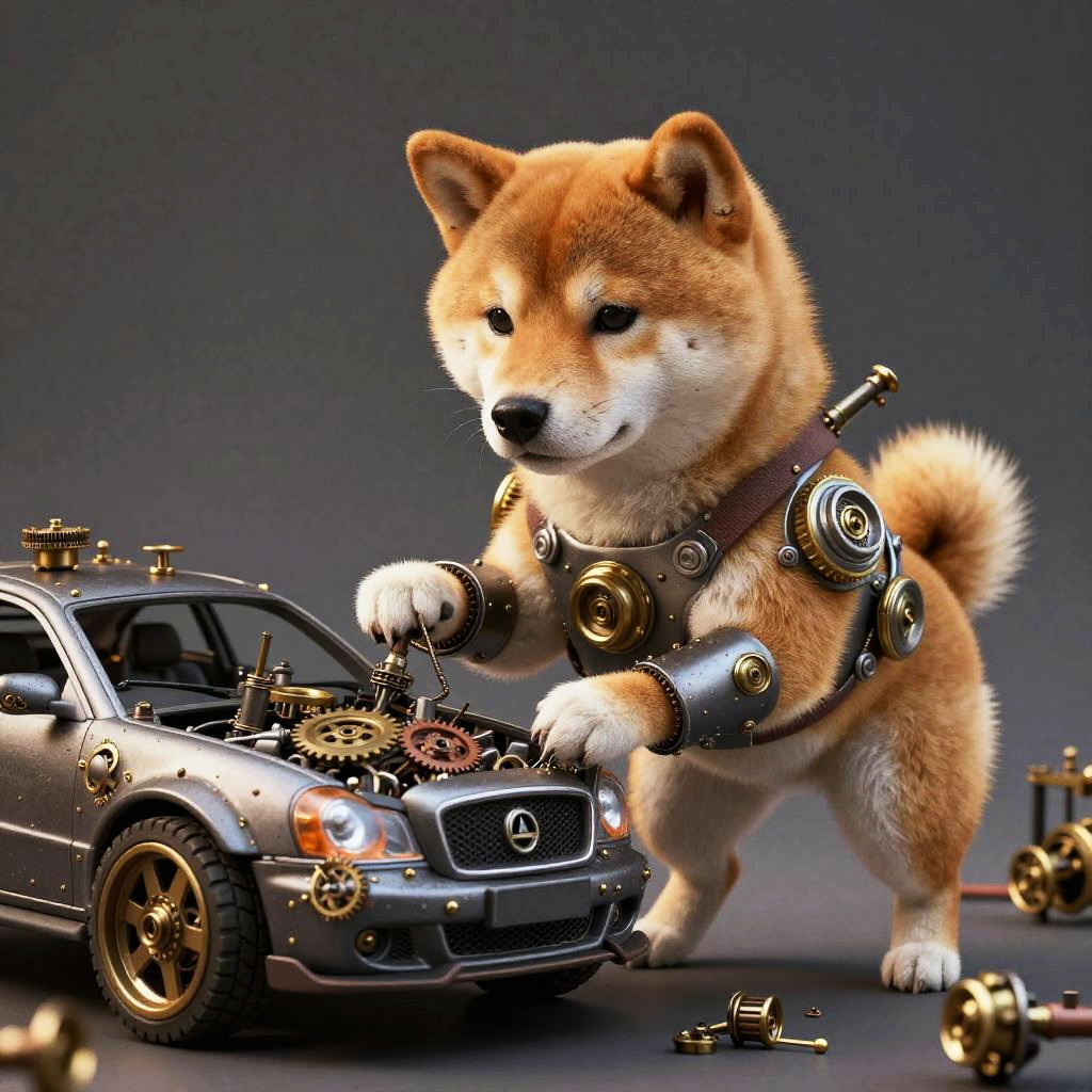 An anthro shiba inu mechanic full body fur is repairing his steampunk car, detailed, realistic, 8k uhd, high quality