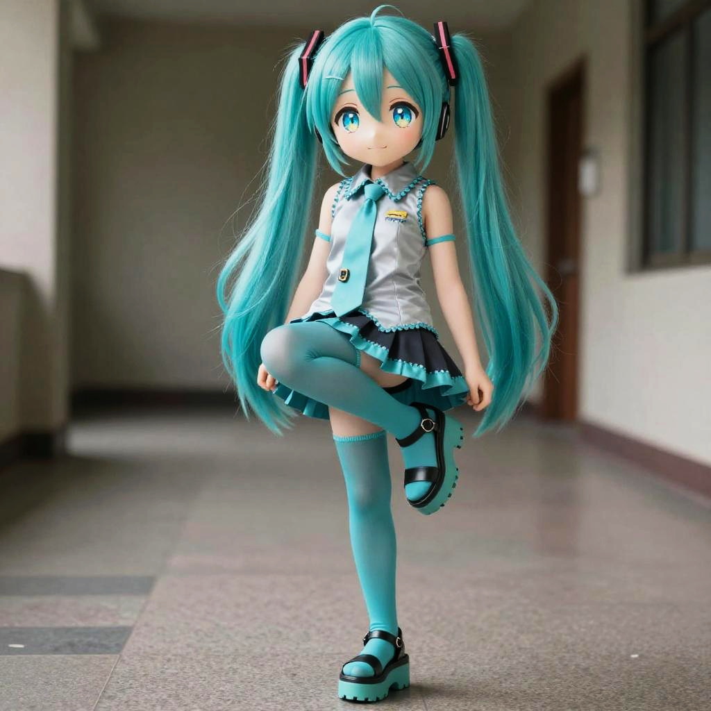 This is a digital CGI image of Hatsune Miku, a popular Japanese virtual singer. She has long, turquoise twin-tails, large blue eyes, and wears a sleeveless, white and turquoise top with a black and turquoise mini skirt, and matching thigh-high socks and shoes. She stands in a slightly blurred, indoor hallway with a gray tiled floor and beige walls. The image has a soft, slightly glowing aesthetic, with a focus on Miku's cute, anime-style appearance. Her left leg is raised, and her right hand rests on her hip, creating a playful pose.