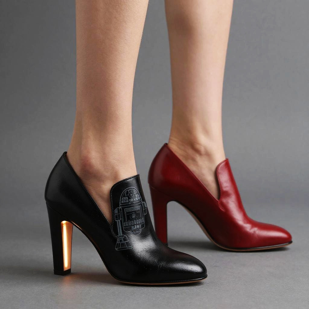 Elegant Star Wars heels combining classic movie elements, shiny black and red leather, subtle droid engraving, glowing light strips, cinematic sci-fi vibe, high-detail fashion shoot.
