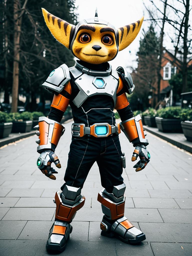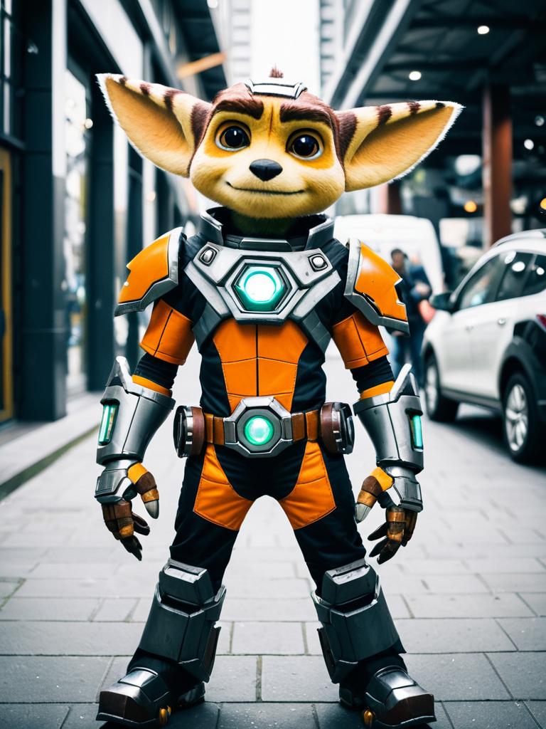 A person dressed in a highly detailed Clank costume from the video game series Ratchet & Clank standing in an urban street setting. The cosplay outfit features large, expressive ears, orange and black armor with metallic silver accents, and glowing blue lights on the chest and wrists.