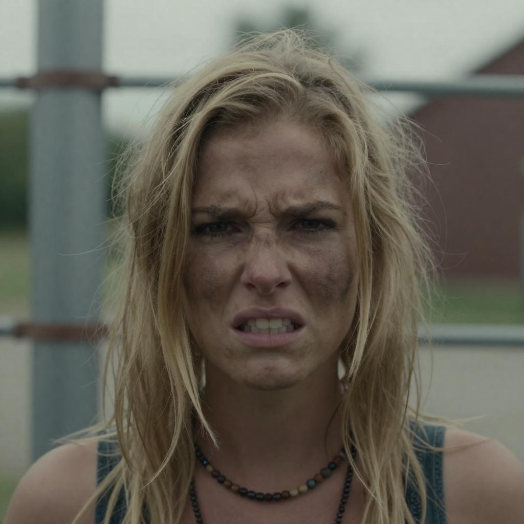 Photograph of a young woman with long, dirty blonde hair, crawling on dry grass. She has blood on her face, arms, and gray sleeveless shirt. Her expression is grimacing with a slightly open mouth. Background includes blurred outdoor elements.