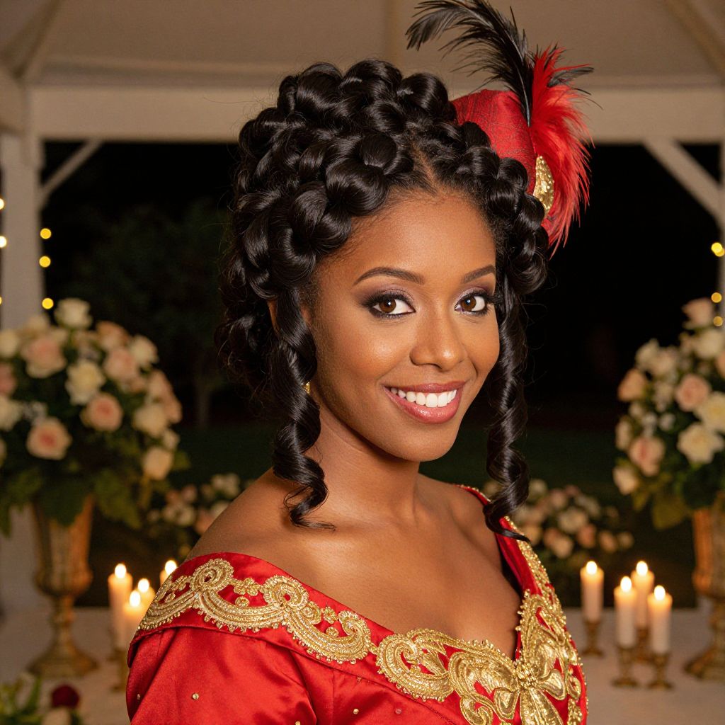 A joyful bride with warm brown skin and expressive brown eyes, styled with a voluminous, intricate braided wedding updo that loops and fans out from the crown of her head, dressed in a vintage-inspired costume with a bright red gown, gold embroidery, and a feathered hat, posing at a candlelit outdoor wedding venue with blooming roses and fairy lights in the background.