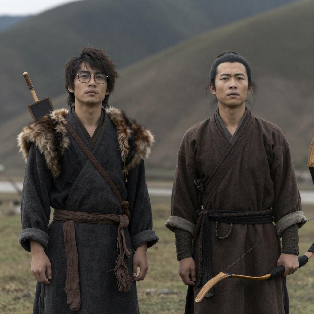 Photograph of two Asian men riding brown horses in a snowy mountainous area. Both are dressed in dark coats, black hats, gloves, and boots suitable for cold weather. A third brown horse with a saddle follows behind them. The background features snow-covered peaks, pine forests, and a clear blue sky.