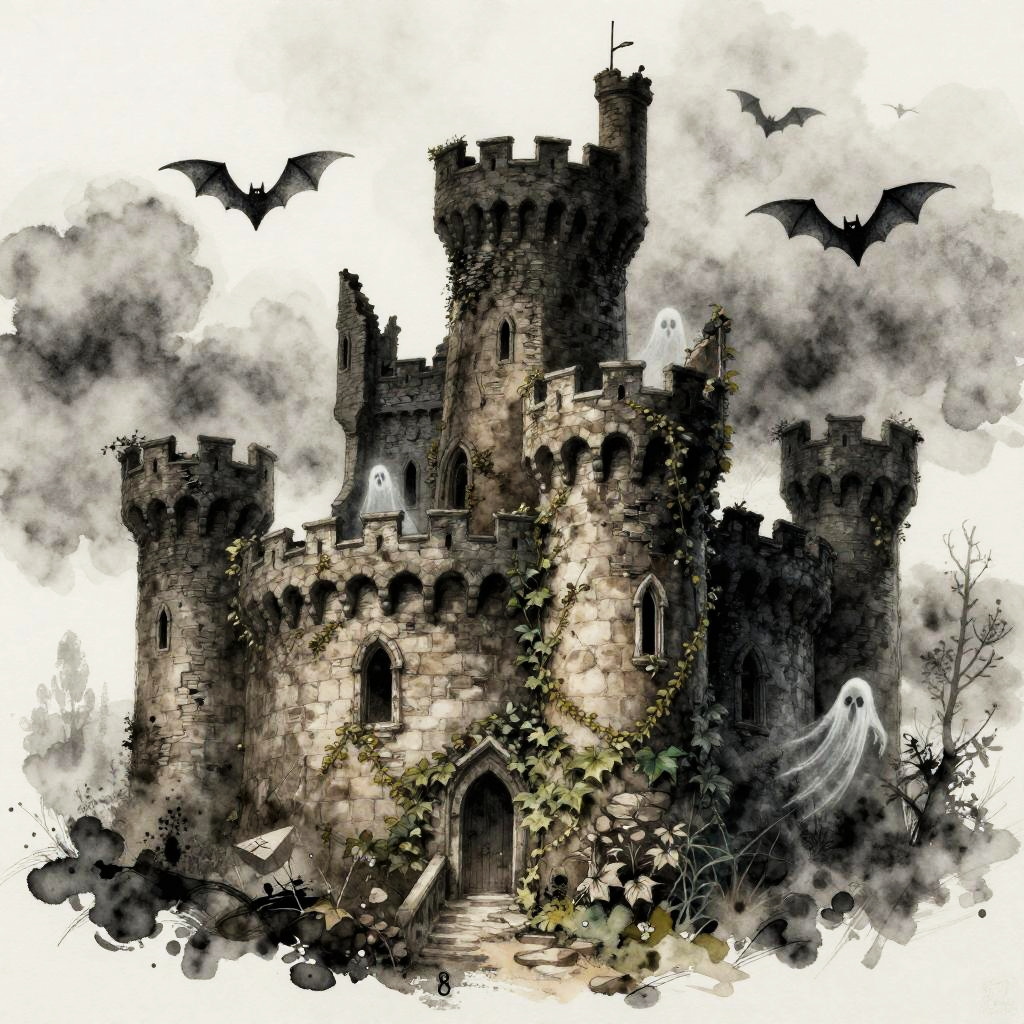 Spooky castle drawing featuring an ancient ruined castle with crumbling stone walls, overgrown ivy, ghostly figures in the windows, and bats flying in a gloomy twilight sky, rendered in dark charcoal and watercolor textures creating an ominous atmosphere.