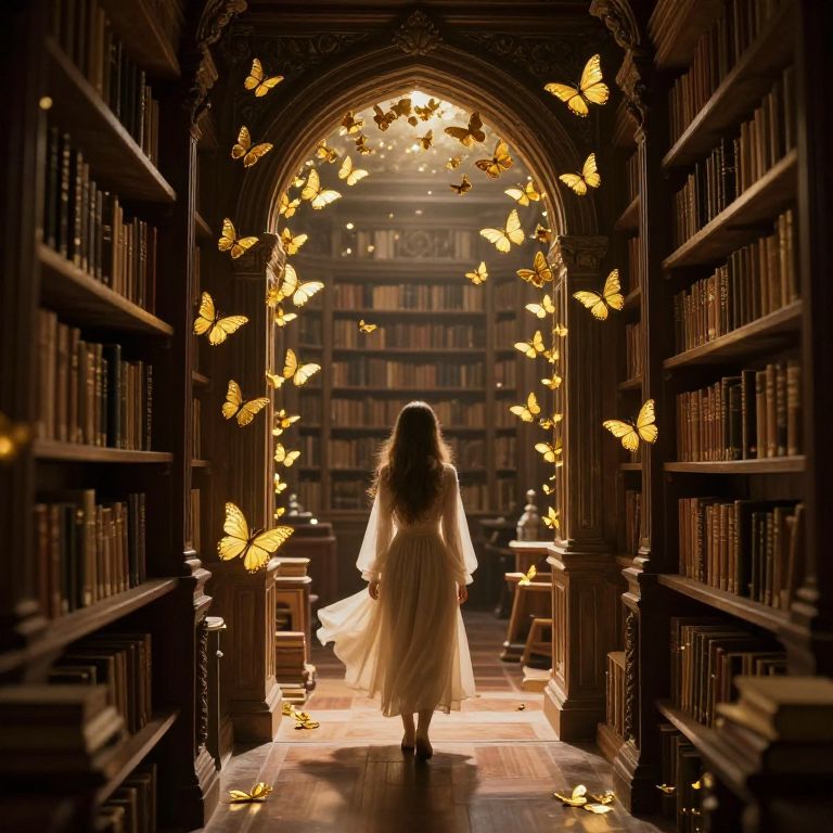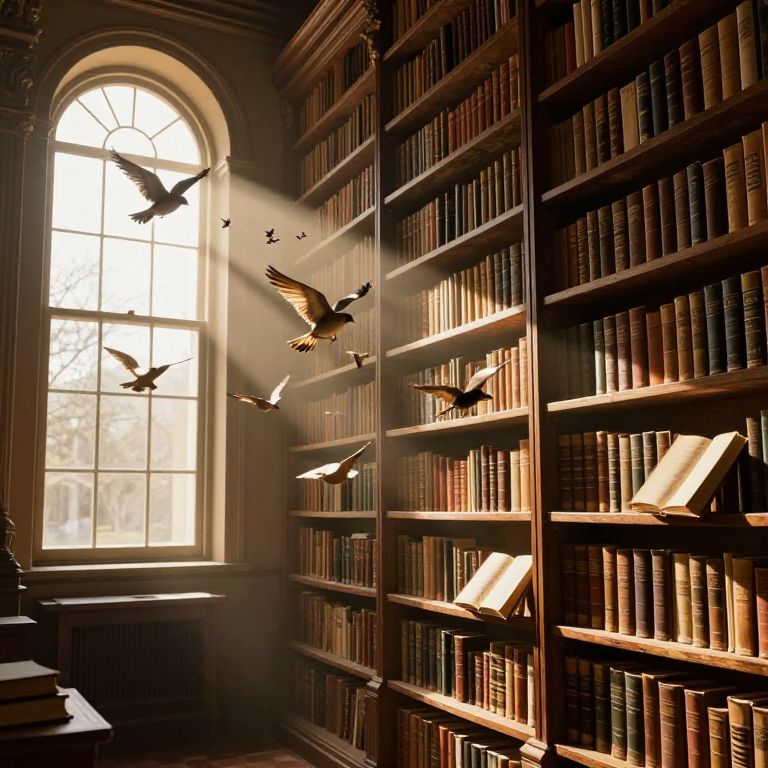 In a surreal, dreamlike library rendered in high-definition digital art, a woman in a flowing red dress stands amidst towering bookshelves as birds soar through the air, symbolizing the flight of ideas and the whispered conversations between books and readers.