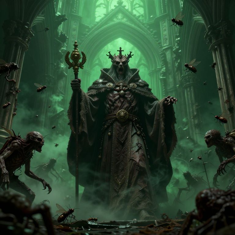 Warhammer god of disease in a plague chapel, grotesque and corrupted priestly robes, surrounded by swarms of diseased insects and mutated creatures, ominous green fog enveloping the scene, baroque gothic architecture in decay, heavy detail on decay and contagion themes