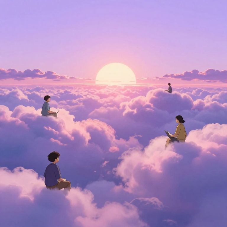 Mockup hundreds of people working, floating in the clouds, pastel purple, studio ghibli style, sunrise,