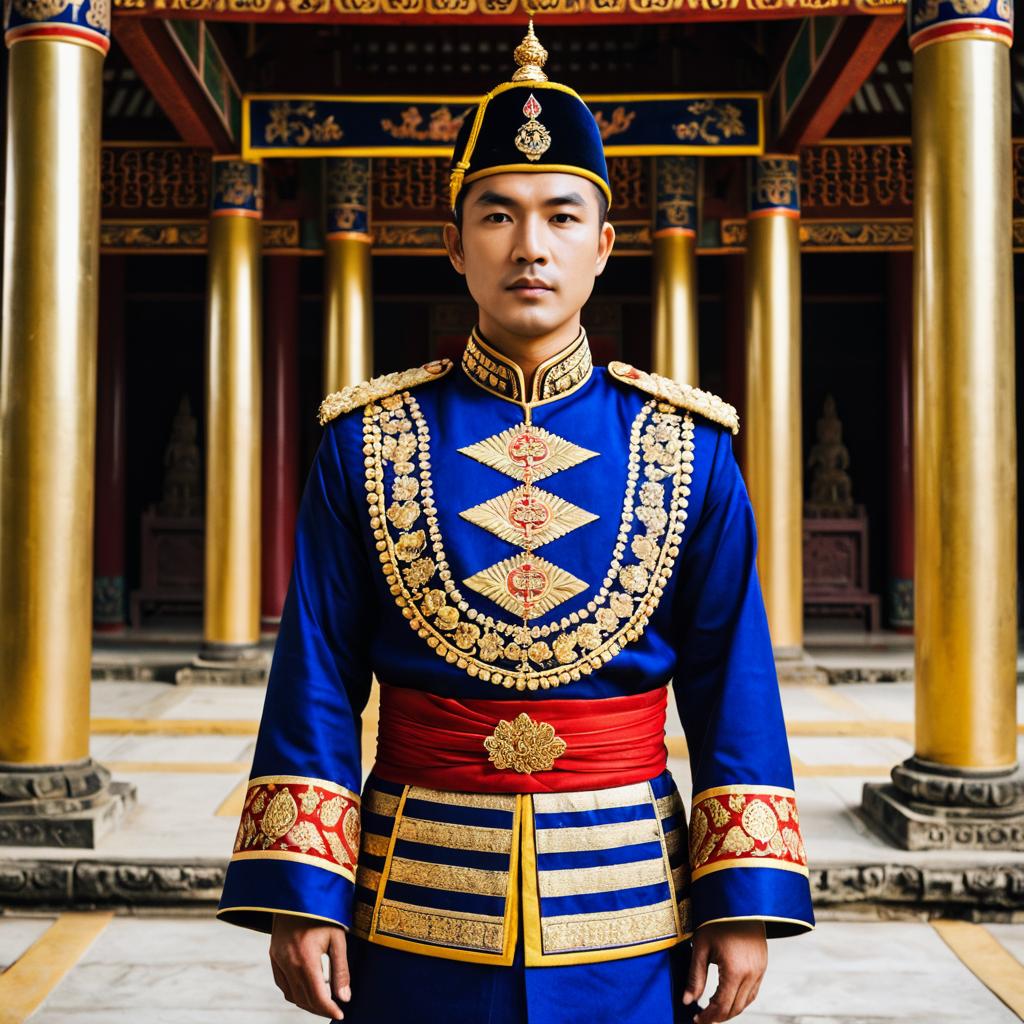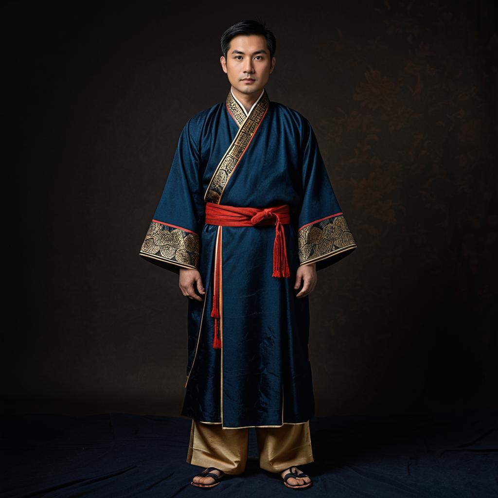 Wishes costume, photorealistic, asian man, standing in traditional chinese courtyard, wearing maroon and gold qipao with red sash, beige pants, red and brown traditional chinese shoes, black and gold hat with red tassels, serious expression, daytime, detailed architecture background, two large potted plants on either side, wooden pathway, clear sky, realistic lighting, historical costume, traditional chinese style, full body shot