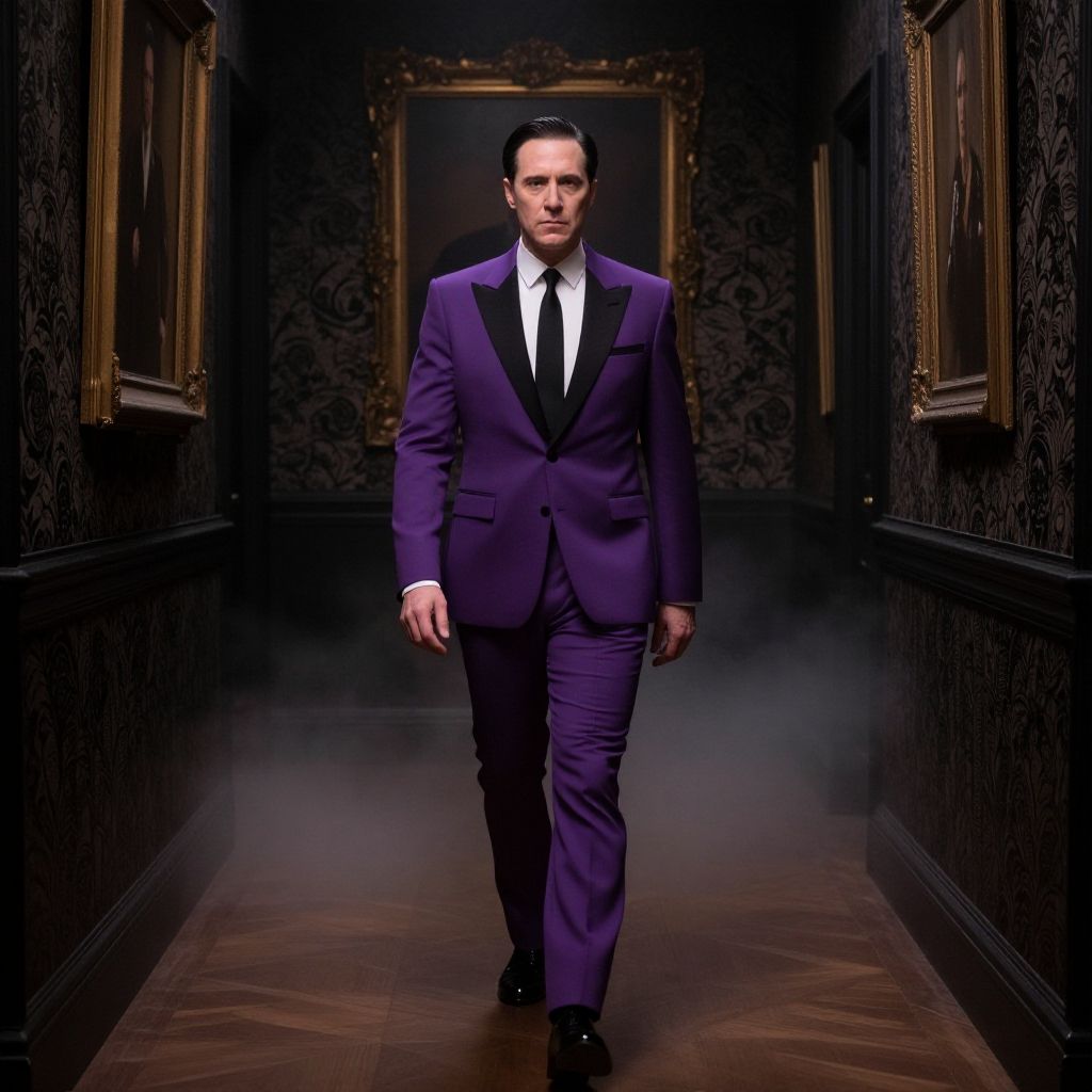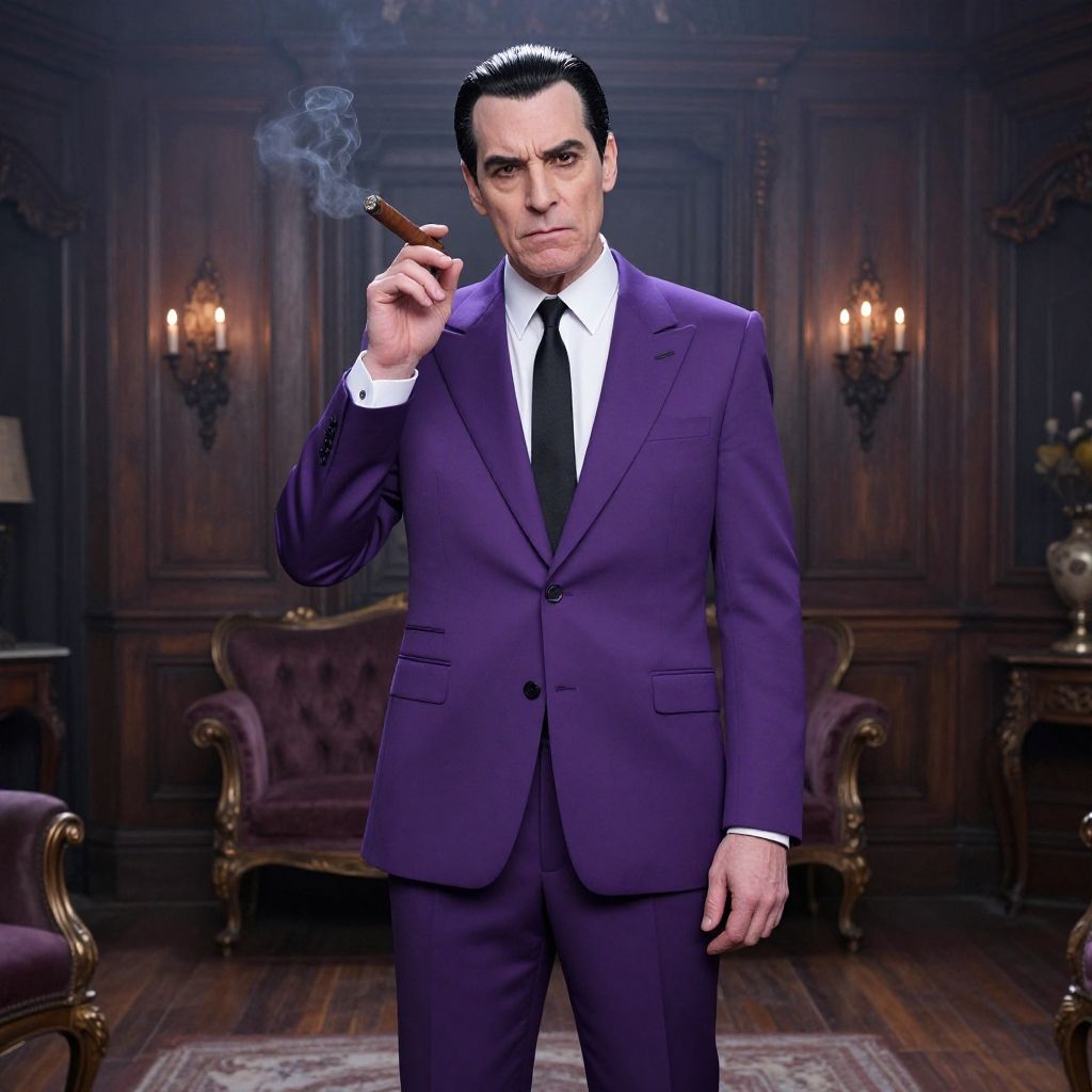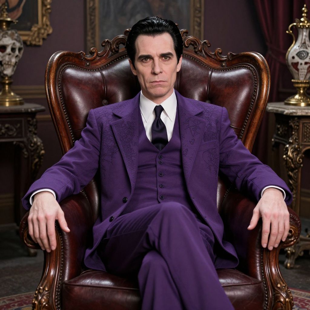 Gomez Addams purple suit, dramatic portrait of a man in an eye-catching purple suit with subtle gothic motifs, seated in an ornate leather armchair, surrounded by creepy vintage artifacts, moody lighting, baroque details emphasizing his charisma