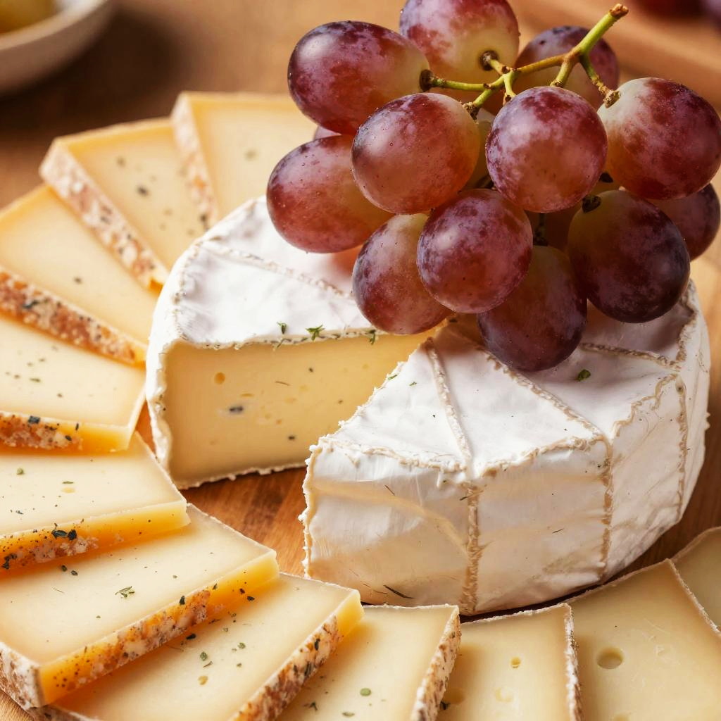This is a close-up photograph of a cheese platter. It features a stack of creamy, white-rinded cheeses with green herbs, topped with a cluster of shiny, red grapes. Surrounding the cheeses are slices of golden-yellow, speckled cheese and a small, twisted roll. The background is a warm, wooden surface, adding a cozy feel. The colors are rich and inviting.