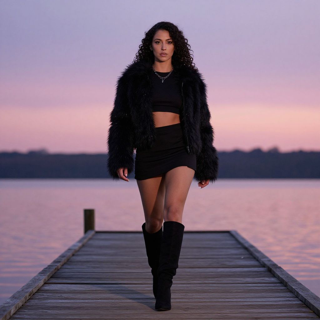 Photograph of a confident woman with curly black hair standing on a wooden deck. She's wearing a white crop top, black lace mini-skirt, and black ankle boots. She holds a black jacket over her shoulder. The background is bright with a white railing. She has a serious expression and stands with one leg slightly forward, exuding a strong, stylish vibe.