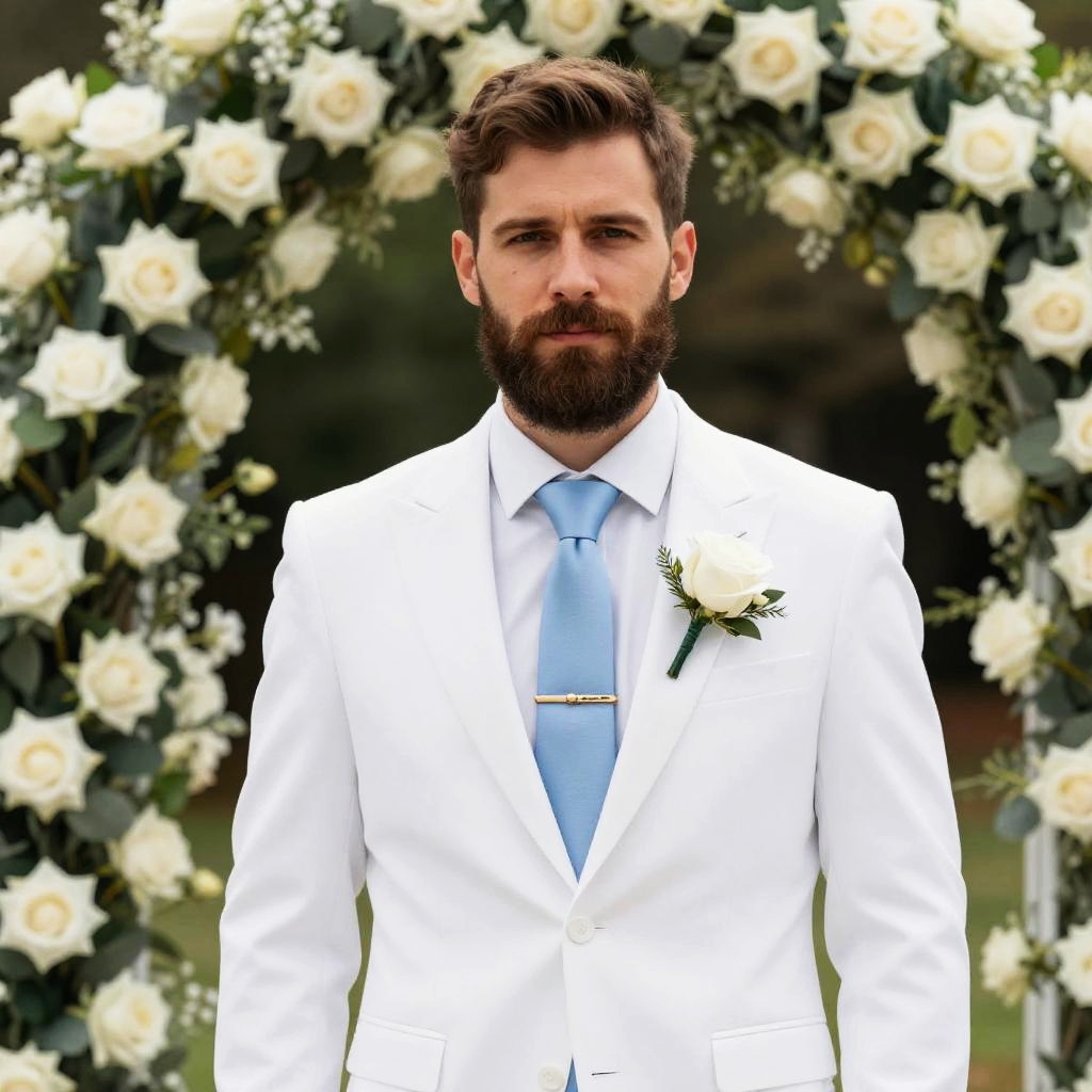 Photograph of a handsome, bearded man with brown hair standing in front of a white floral arch. He's wearing a crisp white suit with a light blue tie and a white rose boutonnière. The background is slightly blurred but filled with creamy white roses and greenery. He looks serious and confident, with a slight smile. The overall vibe is elegant and formal.