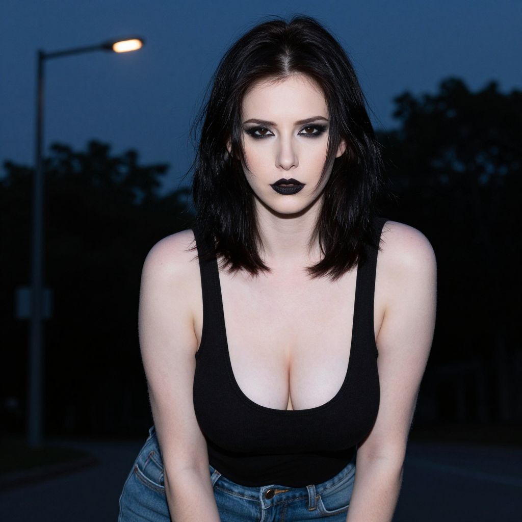 Photograph of a woman with pale skin and dark brown, shoulder-length hair, wearing dramatic black makeup including dark lipstick. She has large breasts, dressed in a low-cut black tank top that reveals cleavage, and blue jeans. She's leaning forward slightly, with a streetlamp and trees in the blurred, dark blue evening background. Her expression is neutral, and the lighting highlights her figure.
