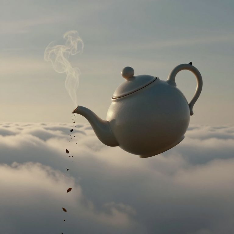 A surreal, digital illustration depicts a large, white, teapot with a rounded body and a curved spout, floating in the sky above a layer of fluffy, white clouds. The teapot emits wisps of steam and small, floating tea leaves. The background features a gradient sky transitioning from pale blue to soft pink, suggesting either dawn or dusk. The teapot's lid has a small knob, and its handle is curved and smooth. The overall style is whimsical and dreamlike, with a focus on gentle, pastel colors and soft textures.