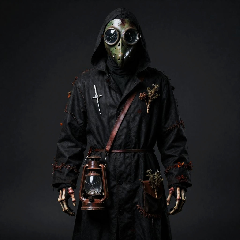 Halloween outfit, worn by plague doctor revenant, featuring worn beaked mask with cracked glass lenses, long oilskin coat stitched with surgical instruments and dried herbs, lantern hanging from a leather satchel, gloved bone-like hands, in dull bone, soot black, sickly green with rusty blood-red accents.