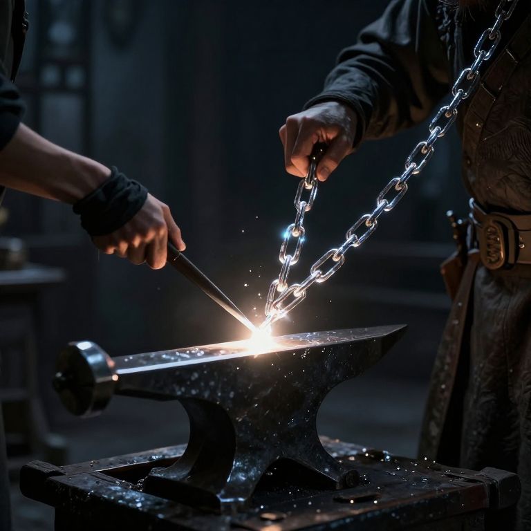 A virtual blacksmith forges liquid shadows into luminescent chains, binding the light of unremembered dreams.