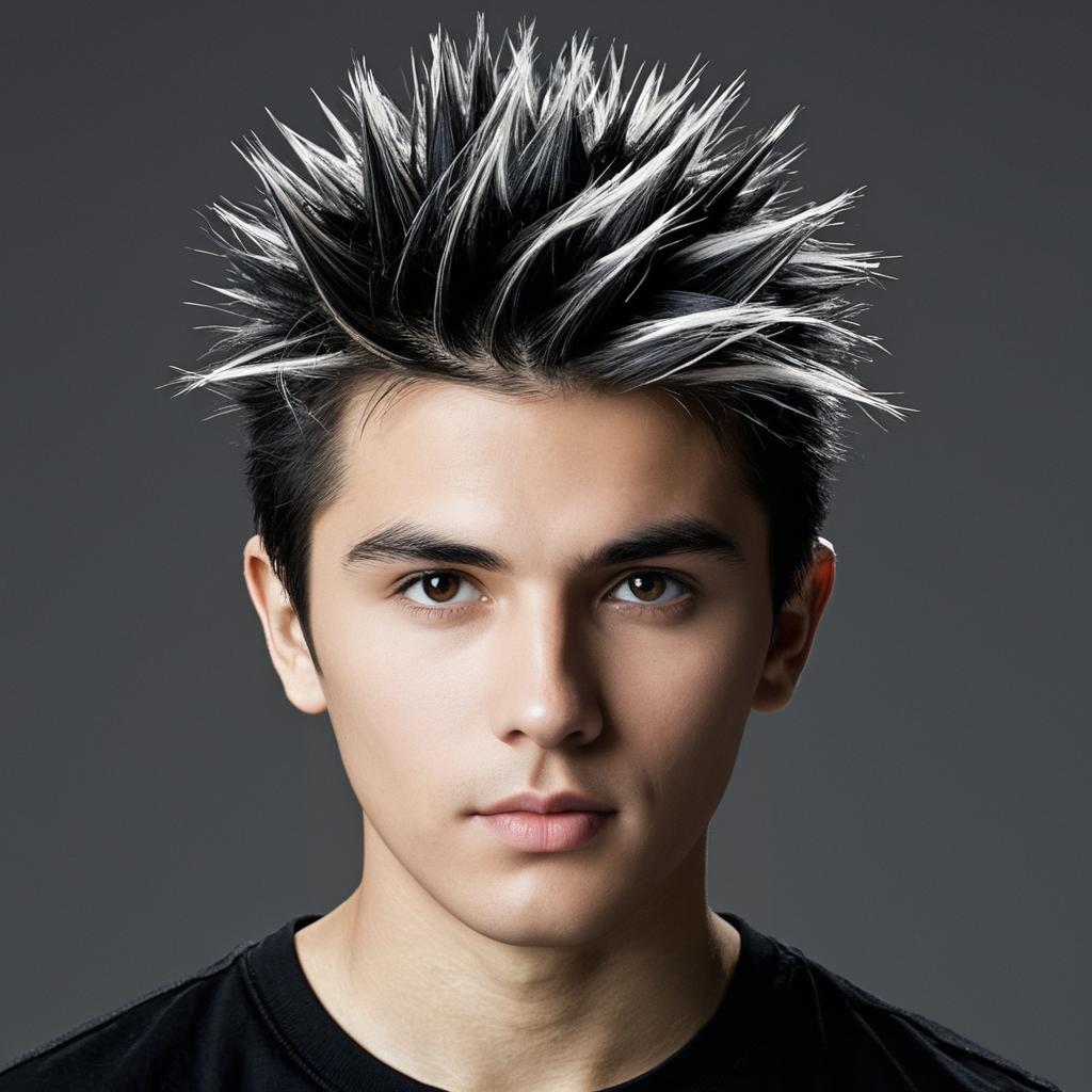 Portrait of a young Asian male with striking classic spiky hairstyle featuring black hair with white tips. He is wearing a simple black t-shirt with short sleeves and has a neutral expression, looking directly at the camera against a plain grey background.
