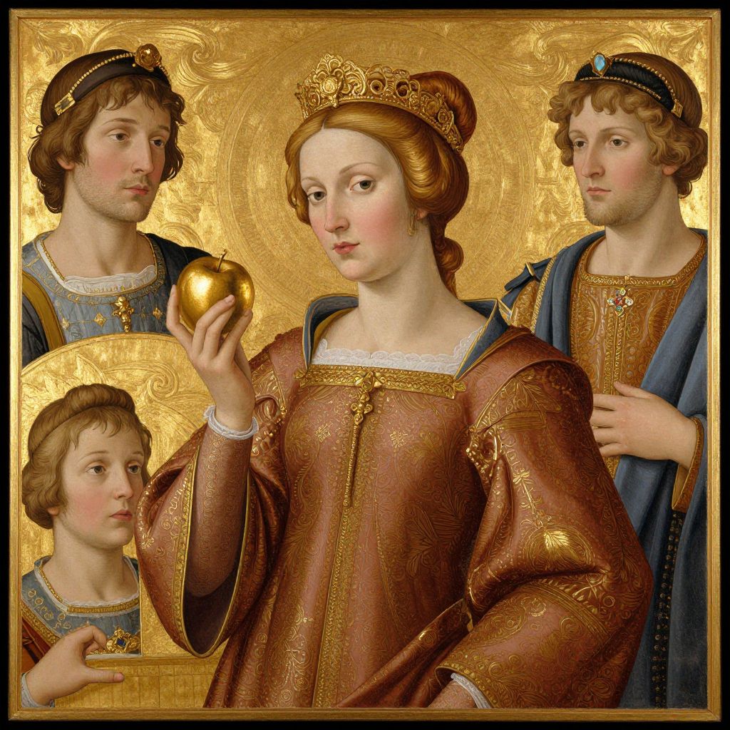 This digital reproduction of a Renaissance-style painting depicts a fair-skinned woman with red hair, adorned in an ornate, deep red gown with gold embroidery, holding a golden apple. She is crowned with a delicate gold crown. Surrounding her are three versions of a young, fair-skinned man with brown hair, wearing blue and gold robes with intricate patterns, each looking at her with varying expressions of curiosity and contemplation. The background is a rich, golden texture, emphasizing the opulent and regal nature of the scene. The composition highlights the woman's central role and the symbolic apple, possibly representing knowledge or temptation.