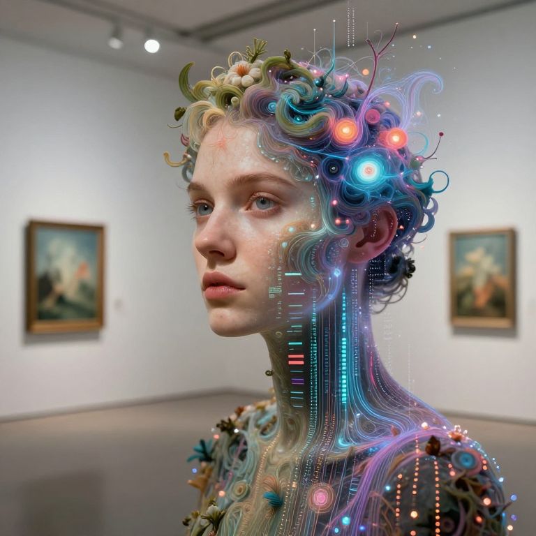 Digital artwork depicting a young, fair-skinned woman with curly blonde hair adorned with neon lights and swirling, colorful patterns. Her face is serene, with subtle freckles and blue eyes. Her neck and shoulders feature intricate, glowing lines and circuitry. She wears a patterned garment with blue and green floral elements. The background is an art gallery with white walls and two framed paintings, slightly blurred, creating depth. The lighting is soft, highlighting the woman's ethereal, cybernetic appearance. The overall style blends realism with futuristic, digital art elements.