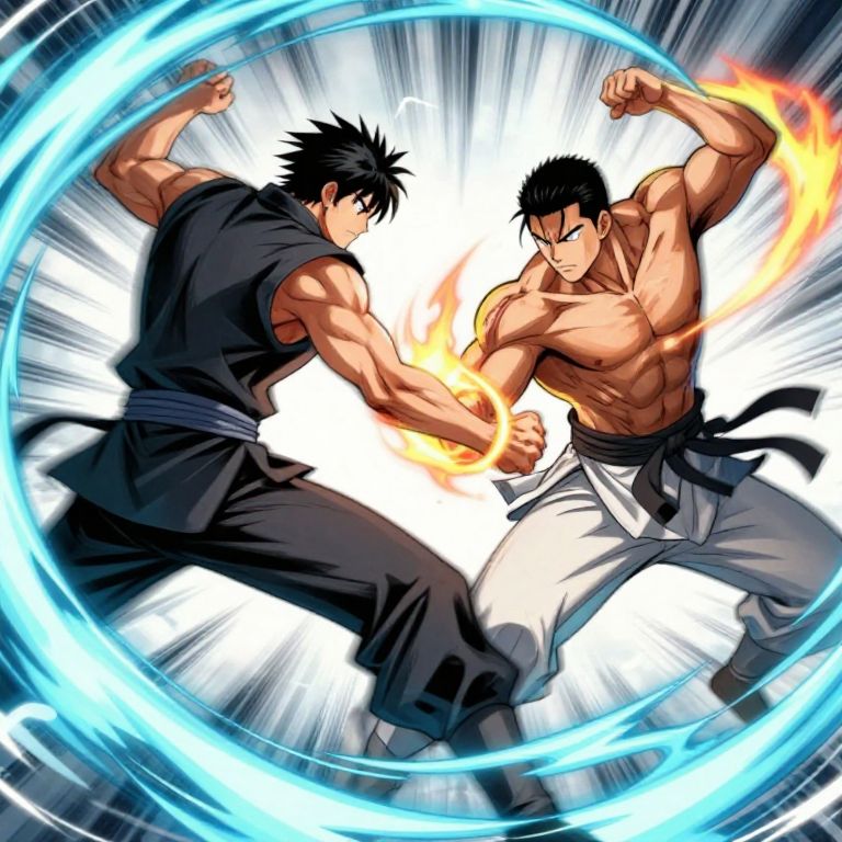 This dynamic digital anime-style illustration depicts two muscular, black-haired male fighters, one in a black sleeveless top and pants and the other shirtless with white pants, engaged in an intense battle. The fighter on the left has his back to the viewer, while the one on the right faces forward, with both characters in mid-fight stances. A glowing blue energy ring encircles them, and flames emanate from the right fighter's fist. The background is white with black speed lines, emphasizing the action. The illustration uses bold lines and vibrant colors, enhancing the dramatic and energetic atmosphere.