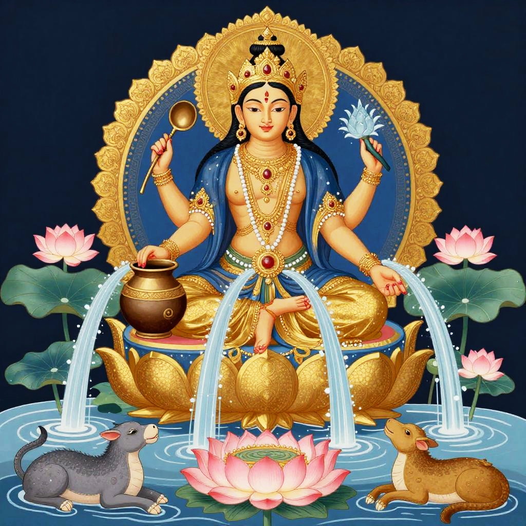 Hindu goddess of water illustrated in classical style, holding a water pot with flowing water streams, surrounded by mythical animals and lotus blossoms, rich gold and blue palette.