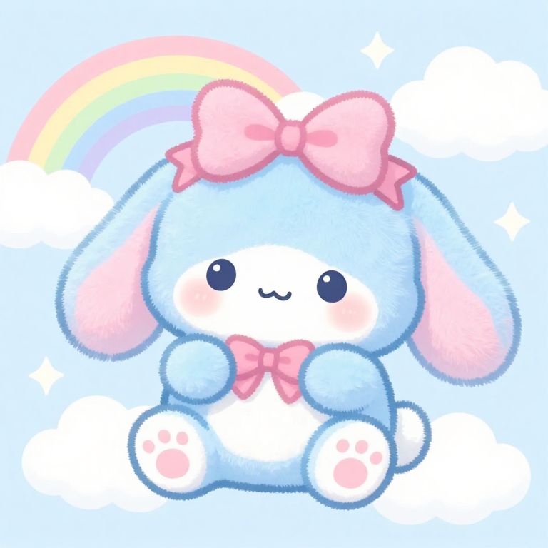 Pastel kawaii furry art of a chubby bunny with pastel blue and pink fur, wearing a tiny bow, sitting among clouds and rainbows, with sparkles and cute blush highlights, evoking a soft, gentle atmosphere with a magical cute style and velvet textures.