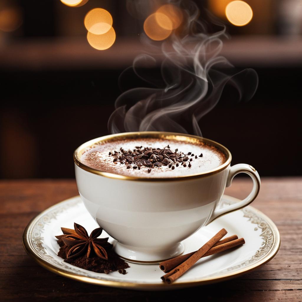 A hyper-realistic, close-up view of a traditional chai tea in a white ceramic cup on a ornate brass saucer. The hot chocolate has a rich, dark brown color, topped with a layer of foam with a sprinkle of cardamom and a drizzle of chocolate syrup. There are a few fine cinnamon dusting scattered on top for added texture and sweetness. Wisps of steam rise from the cup, creating a warm, cozy feel. The background is softly blurred, suggesting a Indian street market atmosphere, with hints of wooden textures. The lighting emphasizes the smooth, creamy texture and deep chocolate color, making it look rich and inviting.