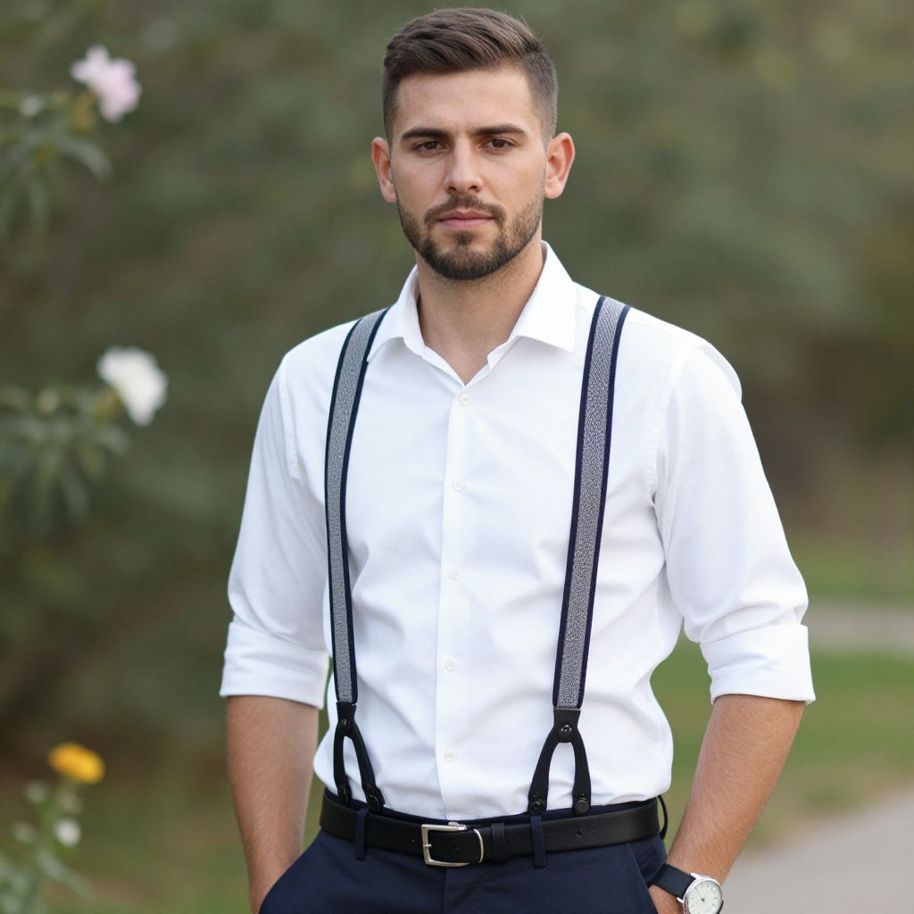 Photograph of a handsome young man with short, dark brown hair and a neatly trimmed beard standing outdoors. He wears a crisp white dress shirt with rolled-up sleeves, black suspenders, and black pants with a belt. His right hand is in his pocket, and he wears a wristwatch on his left wrist. The background is blurred, featuring greenery and a few white and yellow flowers, creating a natural, serene setting. The man's serious expression and confident stance are prominent. The image has a sharp focus on the subject, with a shallow depth of field.