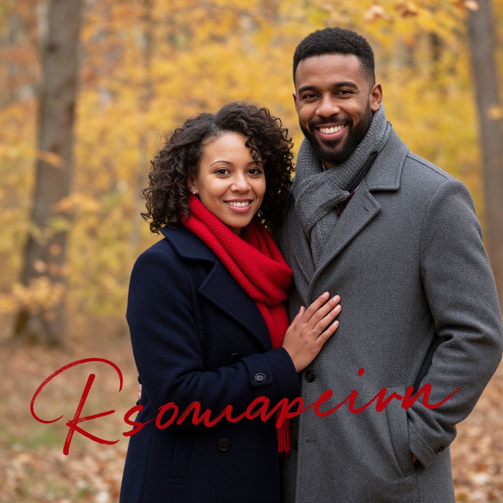Photograph of a smiling black couple standing close together in an autumn forest. The woman with curly hair, wearing a dark blue coat and red scarf, has her arm around the man's waist. He has short black hair, a beard, and is dressed in a gray coat with a gray scarf. The background is blurred with yellow and orange leaves. Red cursive text overlays the image.