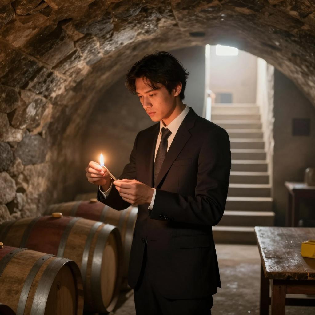 Man in dark suit, white shirt, and tie, holding lit match, standing in dimly lit stone cellar. Arched ceiling, large barrels, and stairs in background. Wooden table with yellow object on right. Misty light at stairs. Man's expression focused.