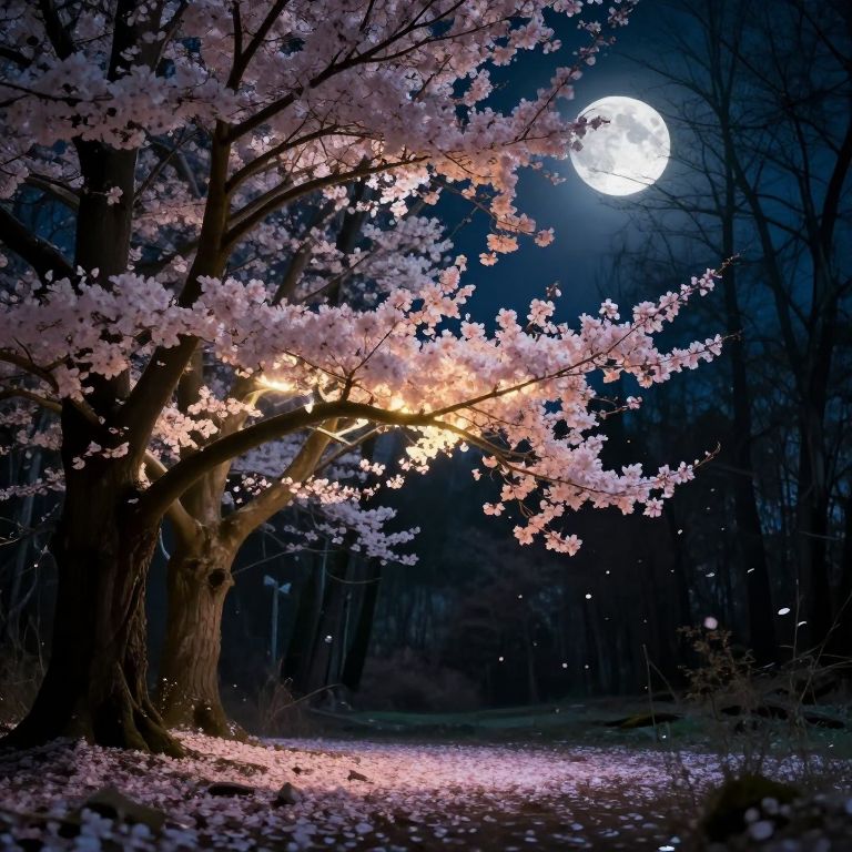 Photograph of a moonlit night featuring a large, curved cherry blossom tree with pink flowers illuminated by soft yellow fairy lights. The full moon, glowing intensely, is visible in the dark blue sky through the branches. The tree's thick trunk and branches dominate the left side, while delicate petals blanket the ground below. The background is a dark forest, with shadowy trees and a faint glow of light filtering through. The overall scene has a magical, ethereal quality, with contrasting warm and cool colors.
