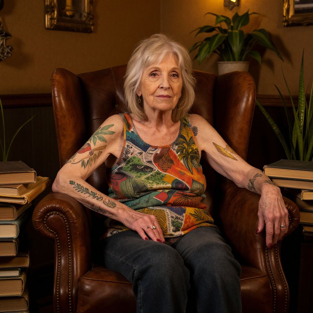 80 year-old woman with tattoos sitting on a vintage leather armchair surrounded by old books and plants, vibrant tattoos inspired by nature and abstract art on her arms and hands, warm ambient lighting, cozy interior with rustic décor, highly detailed