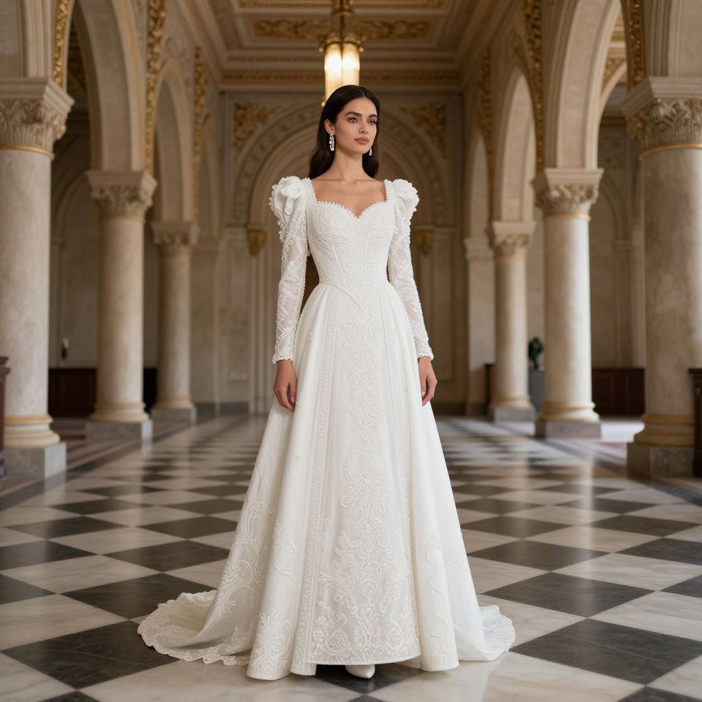 A woman in an intricately detailed, white marble dress stands in a grand, ornate castle hall with arched columns and a checkered floor, exuding elegance and opulence.