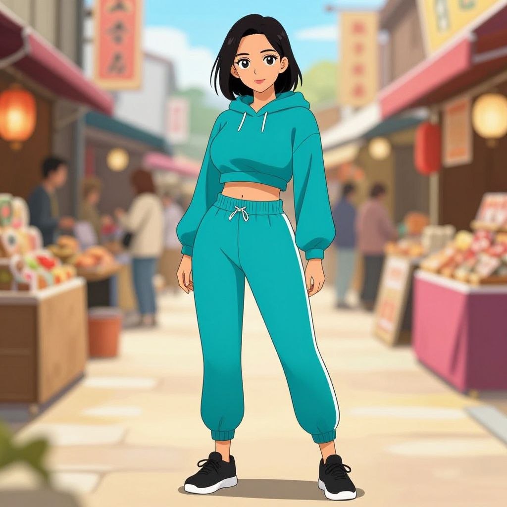 A woman, in a Kyoto Animation style, wearing a teal cropped hoodie and high-waisted joggers with white side stripes, black sneakers, standing in a vibrant bazaar in a town center. Sexy. Pretty face and beutiful eyes Sexy. Pretty face and beаutiful eyes. Big breasts