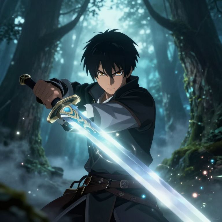 Anime boy with dark hair wielding a glowing sword in a mystical forest, intense gaze, magical particles floating around, detailed clothing with medieval influences, towering ancient trees and mystical fog, dramatic lighting highlighting his determined expression, fantasy style