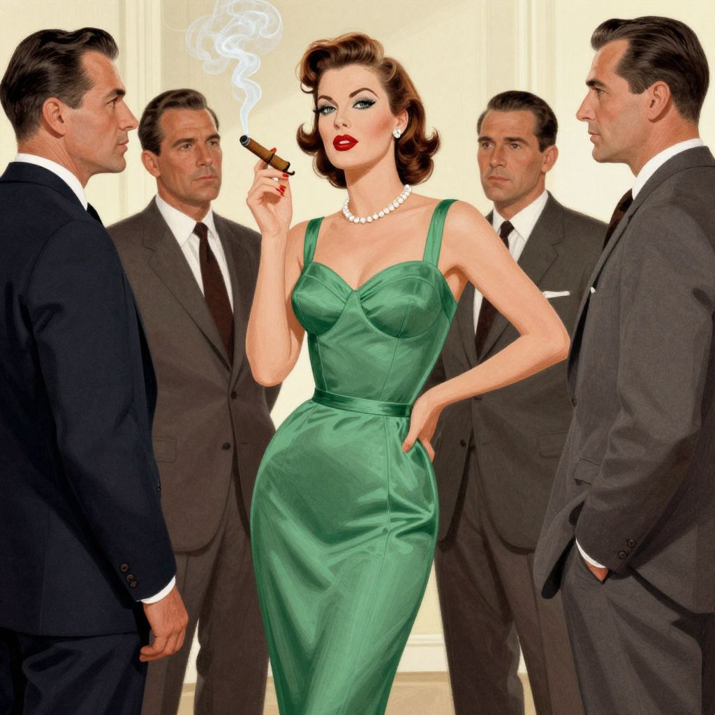 A woman in a green cocktail dress and smoking a cigar, surrounded by men in suits, in a 1950s illustration.