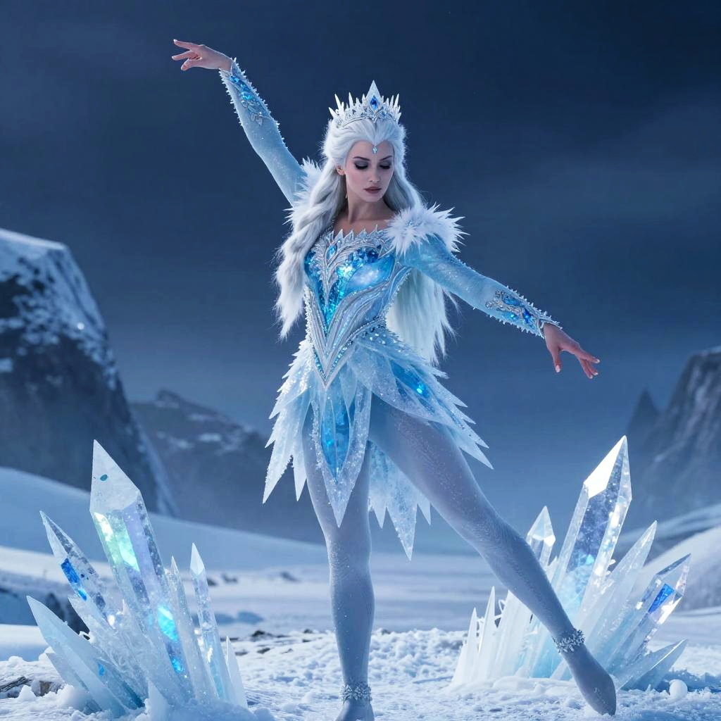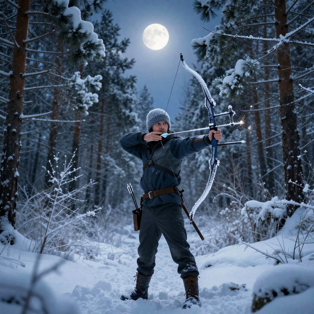 Winter wanderer, cloaked figure in dynamic pose, swirling snowflakes, moonlit icy landscape, cinematic atmosphere, 4K resolution