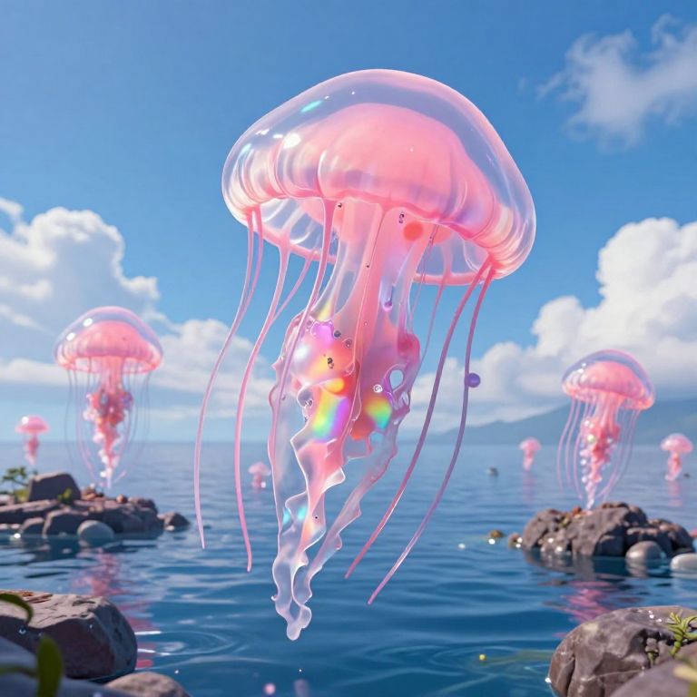 Giant pink jellyfish-like structures emerge from rocky islets, their translucent, rippling bodies casting organic rainbows as they float serenely in a tranquil sky-ocean, surrounded by smaller counterparts under a vivid blue sky dotted with fluffy clouds.
