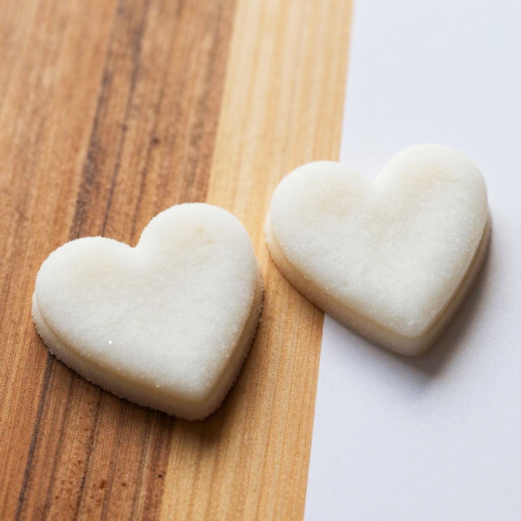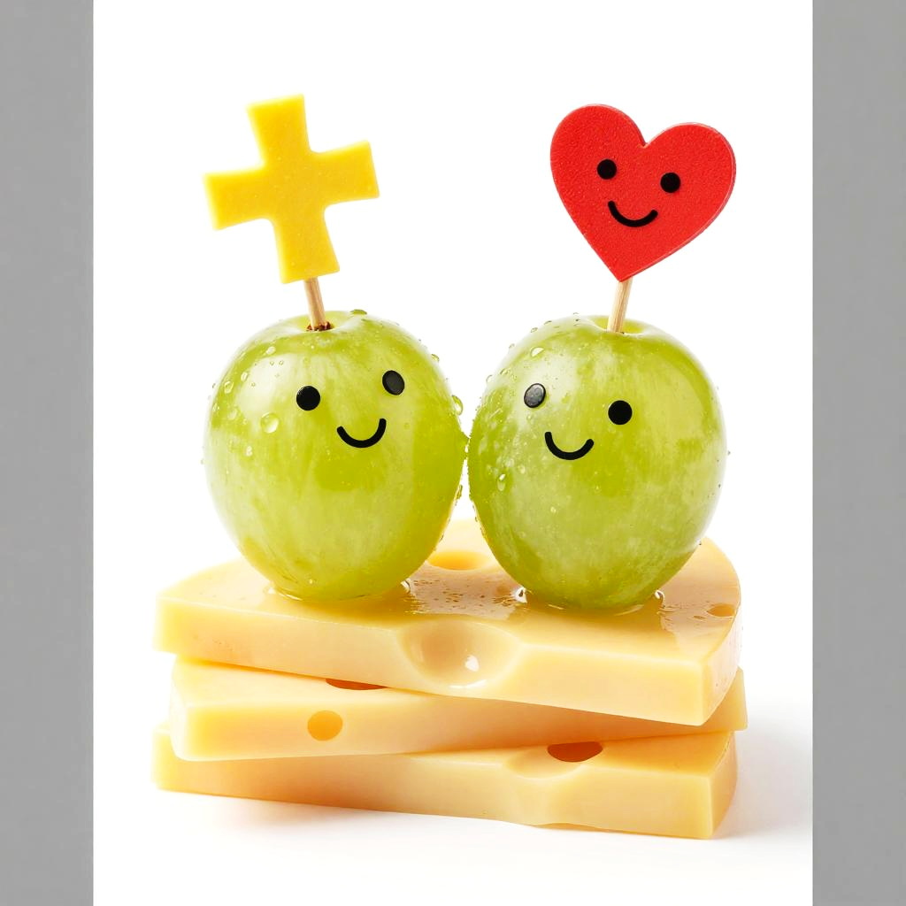 This is a playful photograph of two green grapes, each topped with a cute, colorful pick. The left grape has a yellow cross pick, and the right grape has a red heart pick with a smiling face. They're stacked on top of several slices of yellow cheese. The background is white, and there's a gray border on the left and right edges.