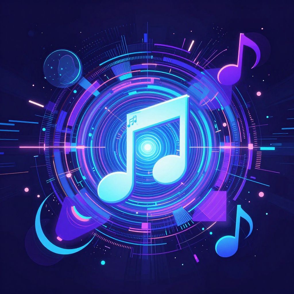 Album cover AI generator illustrating an abstract explosion of music notes and AI symbols, swirling in a vibrant vortex of colors and light, symbolizing the creative power of artificial intelligence in music production and design.