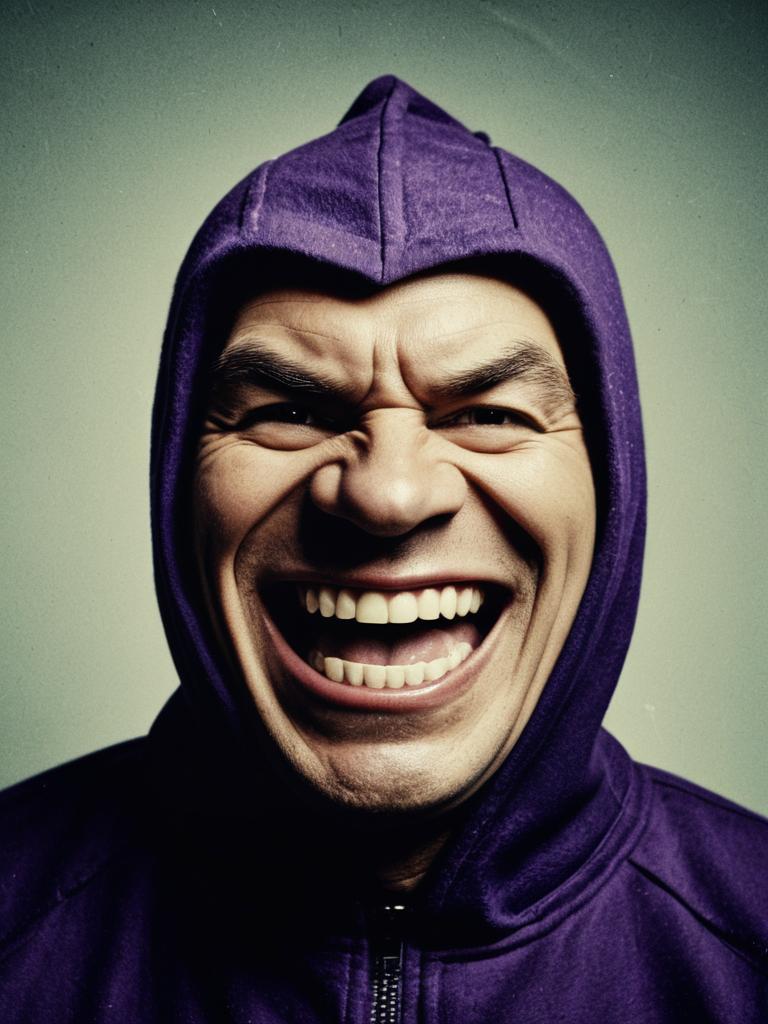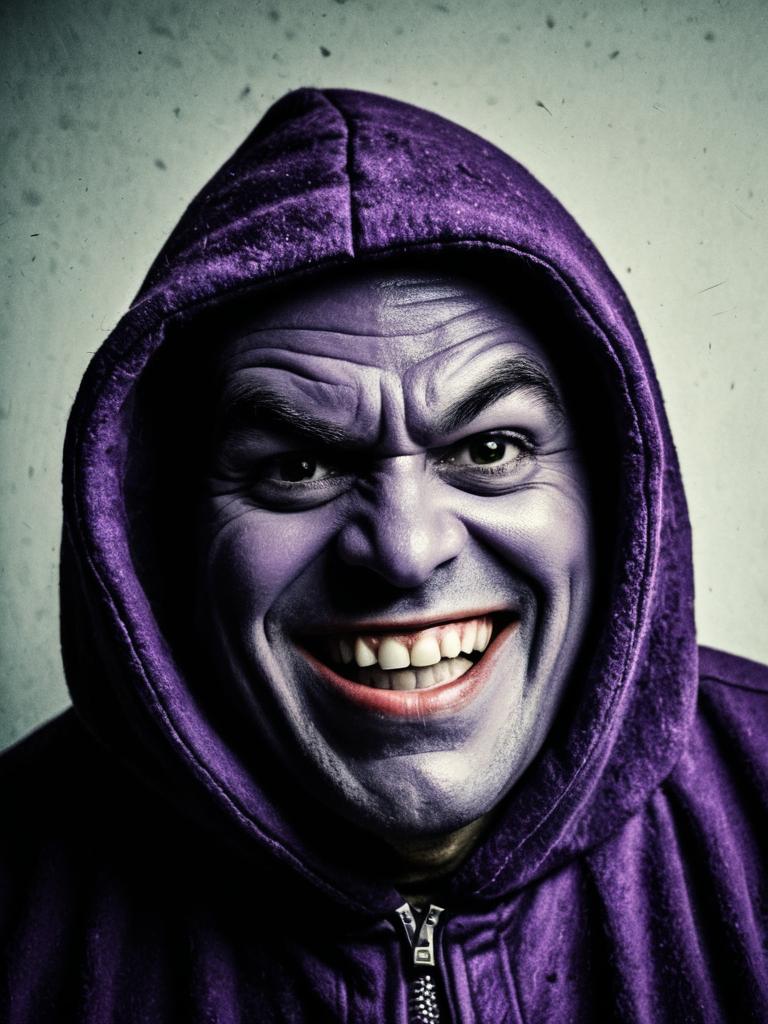 Close-up portrait of a man wearing a purple Grimace costume with face painted purple, exaggerated eyebrows, and a big open-mouthed smile, against a plain textured background. The costume features a hood with a pointed tip.