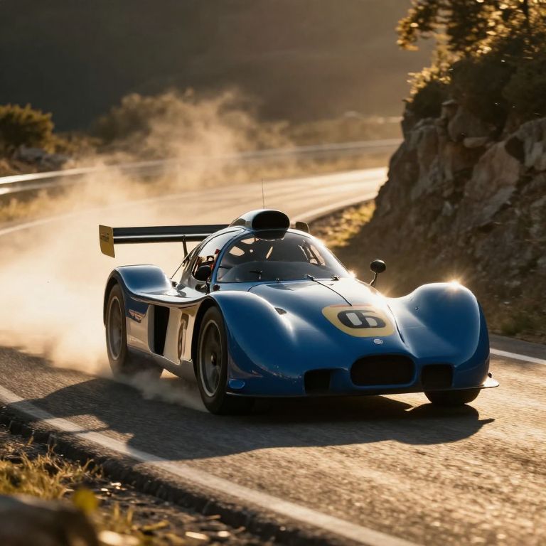 Bwm vintage style racing car on a winding mountain road, golden hour sunlight casting dynamic shadows, dust clouds behind wheels, photorealistic textures on glossy paint, dramatic high contrast lighting, action-packed scene