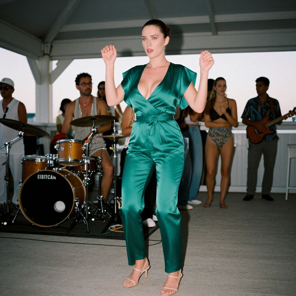 Photograph of a confident woman with fair skin and dark hair in a low bun, wearing a deep green, satin, wrap-style jumpsuit with a plunging neckline, and beige high-heeled sandals. She stands with hands raised, fingers slightly curled, under a white tent. In the background, a drummer in a white tank top and jeans, and several people in casual summer attire, including a woman in a patterned bikini, are visible. A drum set is positioned to the left, and the setting appears to be an outdoor event or concert. The lighting is bright, highlighting the subject and creating shadows behind.