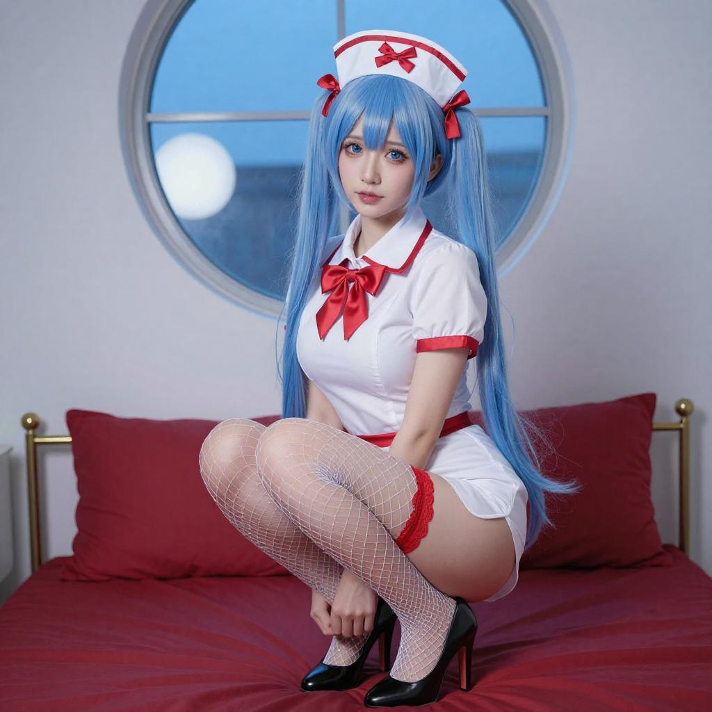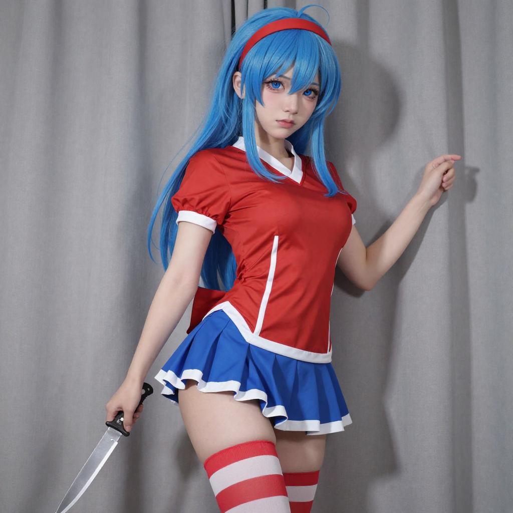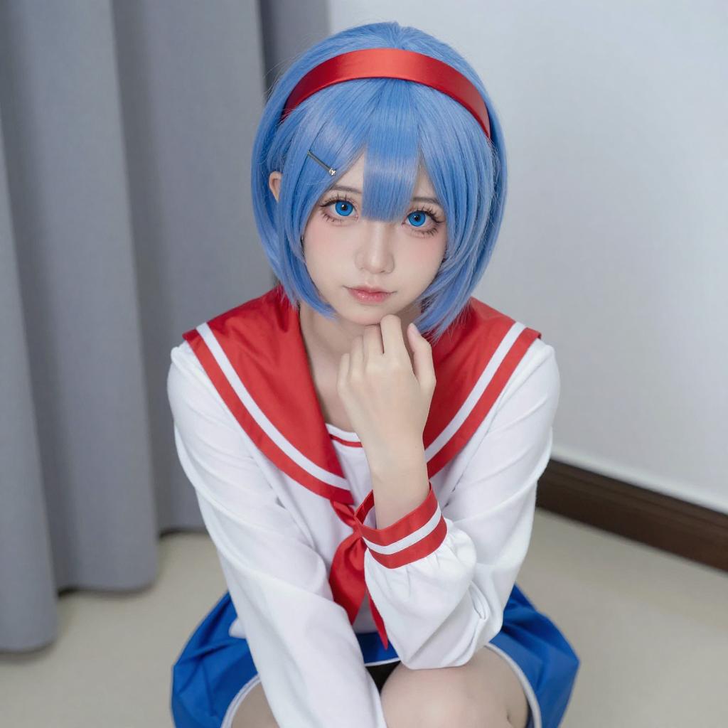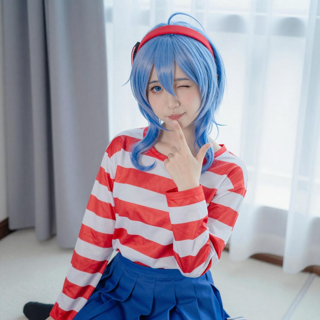 Photograph of a young woman with long blue hair, wearing a red and white cosplay outfit with a red headband, red thigh-high socks, and a blue skirt. She sits on the floor, holding a letter, with a playful expression, in a brightly lit room with white curtains.