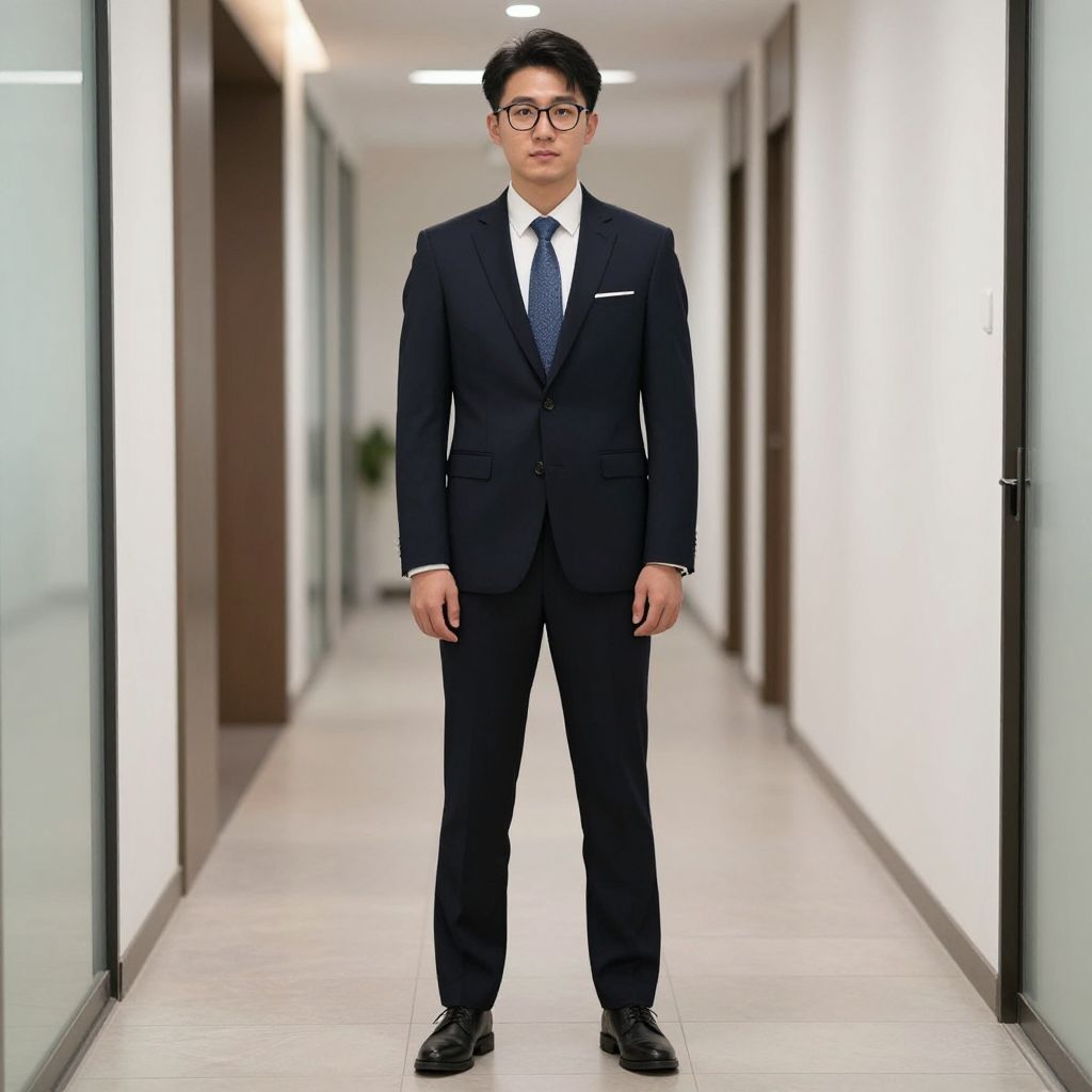 Photograph of an Asian man standing in a bright, modern, white-tiled hallway with glass and wooden doors on both sides. He has short, black hair, wears black-rimmed glasses, a dark navy blue suit, white dress shirt, and a dark blue tie. His expression is neutral, and he stands with his hands by his sides. The hallway has recessed lighting, adding a soft glow, and a blurred green plant is visible in the background. The overall style is sleek and professional.