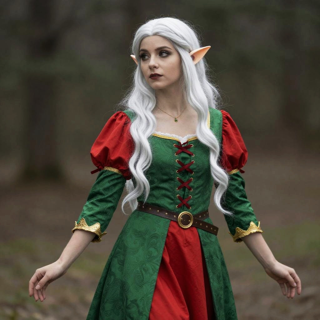 Woman Elf, woman with long white hair wearing a green and red dress