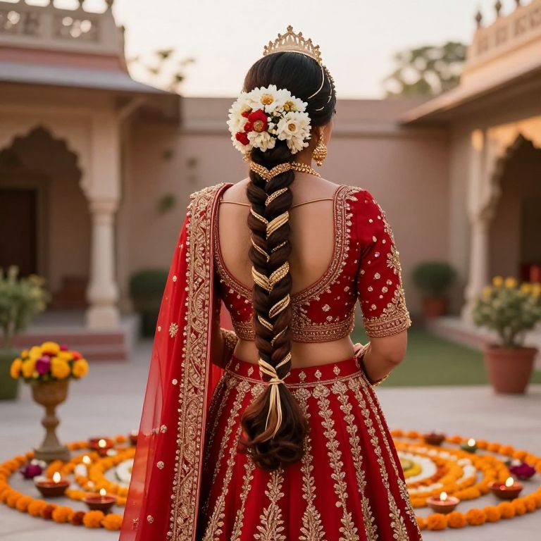 A stunning bride wearing a vibrant red wedding lehenga with intricate gold zari work, adorned with a sophisticated floral crown and a delicate bridal hairstyle featuring large, cascading braids and a twisted bun at the back, standing in a traditional Indian courtyard at golden hour with colorful marigolds and diyas in the background
