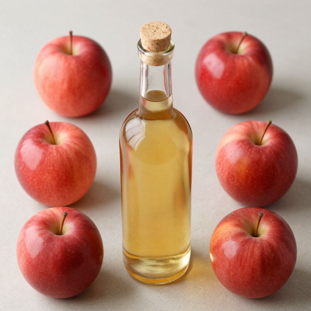 Golden apple cider vinegar rests elegantly in a clear glass bottle sealed with a cork, surrounded by four vibrant red apples arranged symmetrically on a neutral-toned surface, highlighting its natural origins and artisanal appeal.