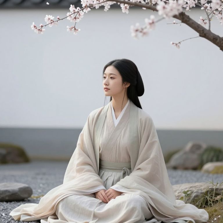 Female:j4y_nlq9dgy= depicted as a serene figure in a minimalist zen garden, soft natural light, pastel tones, flowing robes, delicate blossoms falling, calm and peaceful expression, photorealistic style